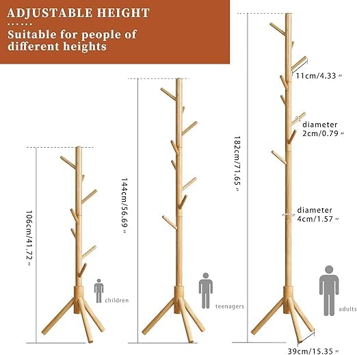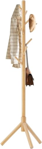 Generic - حامل معاطف خشبي، بعدد 8 خطافات، 3 مستويات ارتفاع قابلة للتعديل، شماعة بتصميم شجرة قائمة لمداخل المنزل، خشب طبيعي