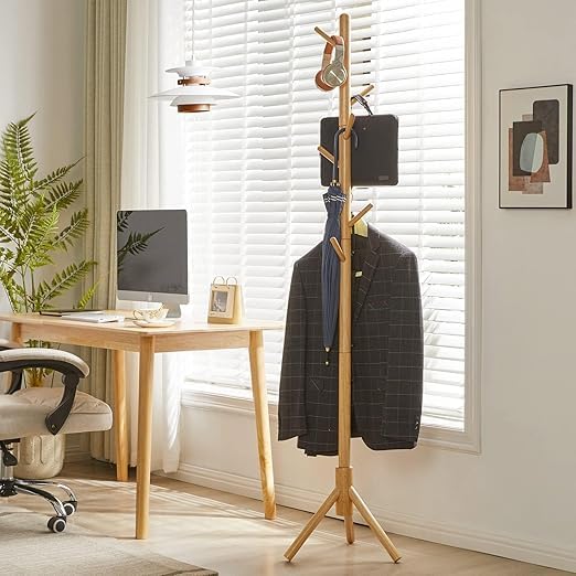 - تصميم قوي ومتین: إطار خشبي صلب مع قاعدة ثلاثية مستقرة يضمن تثبيتًا وحملاً موثوقًا لملابسك وإكسسواراتك.