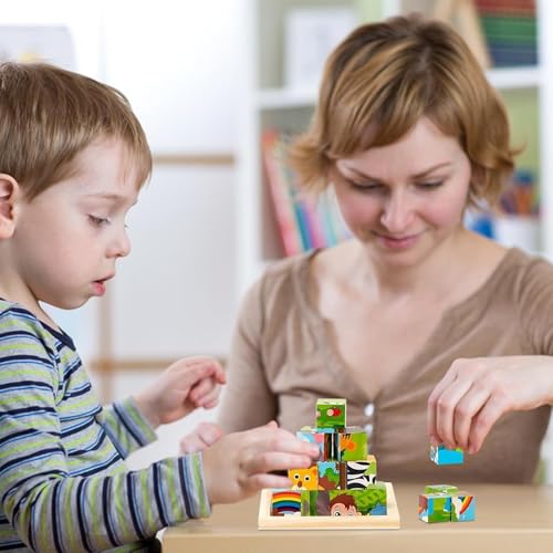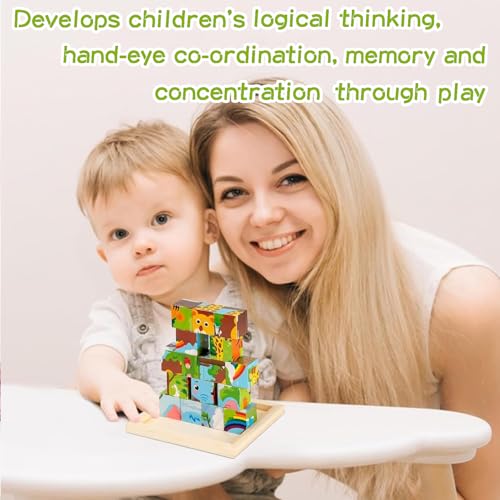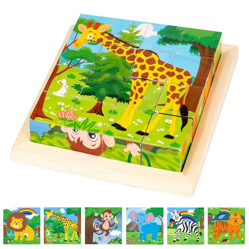 IOPJLK - بازل مكعبات خشبية ثلاثية الأبعاد، بازل 6 في 1 مع رسومات حيوانات، ألعاب مونتيسوري، للتقديم للأولاد والبنات من سن 1 إلى 8 سنوات، 16 مكعب بازل (نمط الغابة)