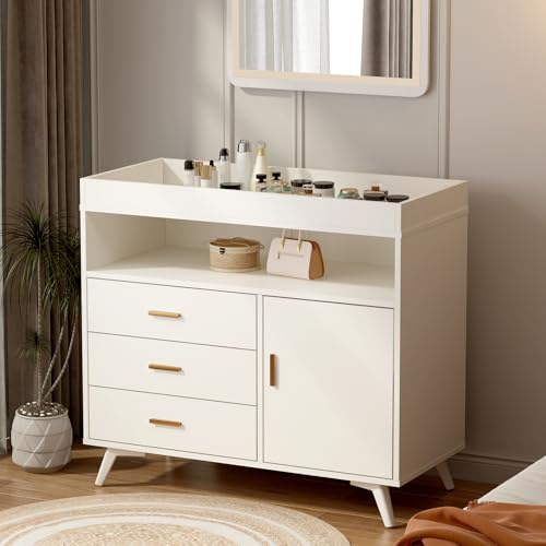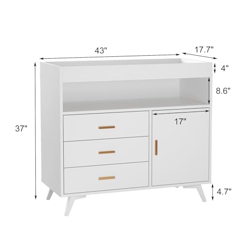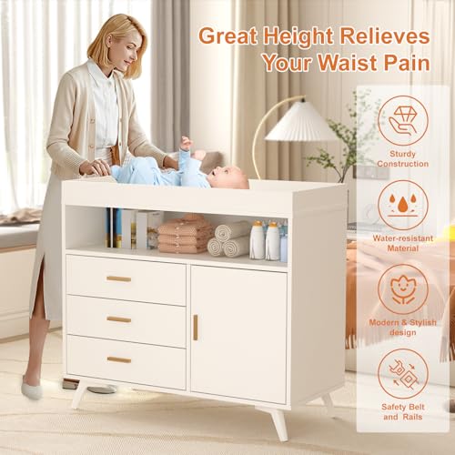 GarveeHome - طاولة تغيير حفاضات خشبية مكونة من 3 ادراج مع حزام امان وقضبان، خزانة مع سطح طاولة تغيير الحفاضات، خزانة ملابس للحضانة، محطة تغيير حفاضات خشبية مع رف مفتوح
