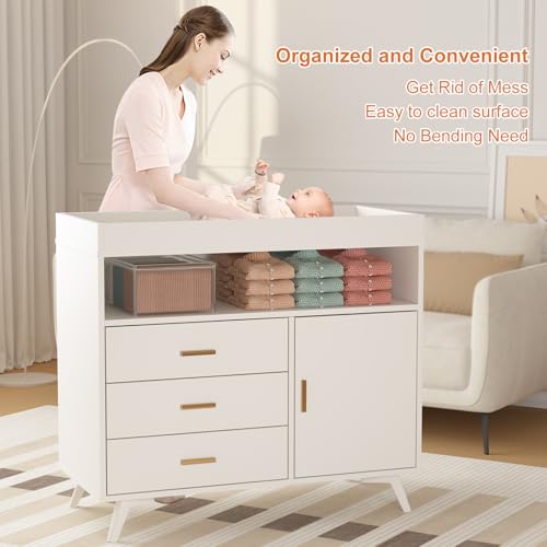 - طاولة تغيير متعددة الوظائف: تحتوي طاولة تغيير الحفاضات هذه على 3 أدراج وخزانة واحدة، والتي يمكن استخدامها كمحطة لتغيير الحفاضات ورف تخزين. يمكنك وضع طفلك على الطاولة لتغيير الحفاضات ولمسها. يمكنك وضع الحفاضات ومستلزمات الأطفال والملابس المتسخة وما إلى ذلك. في الخزانة.