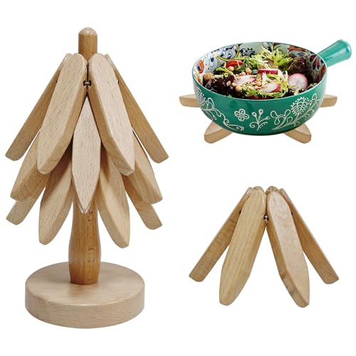 Bukuhlio - قاعدة أكواب خشبية قابلة للطي على شكل شجرة الكريسماس، عمل فني لمفرش طاولة من السكالدينج، مجموعة واقيات وقواعد أكواب خشبية مع رف منظم، حصيرة مائدة (لون خشبي)