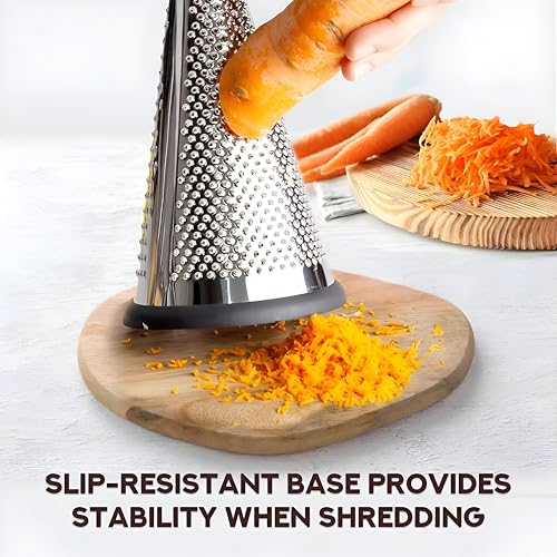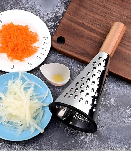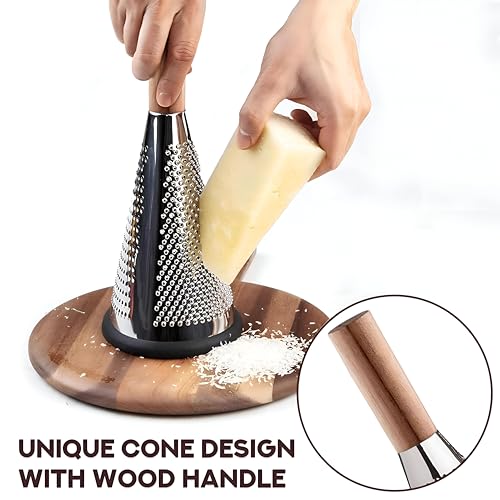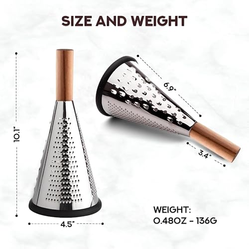- تتميز هذه المبشرة المخروطية المبتكرة بمقبض خشبي مريح يوفر قبضة مريحة وآمنة أثناء الاستخدام، مما يقلل من إجهاد اليد ويعزز التحكم، مما يجعل إعداد الطعام أكثر كفاءة ومتعة.