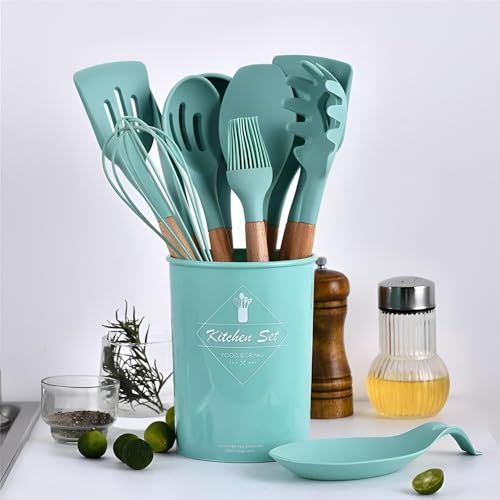 Generic - ادوات مطبخ بمقبض خشبي - مجموعة مطبخ خالية من BPA مكونة من 12 قطعة مع ملاعق مسطحة وملاعق وخفاقة وفرشاة ومغرفة في حاوية تخزين انيقة (اخضر)