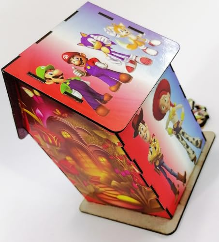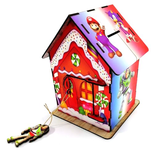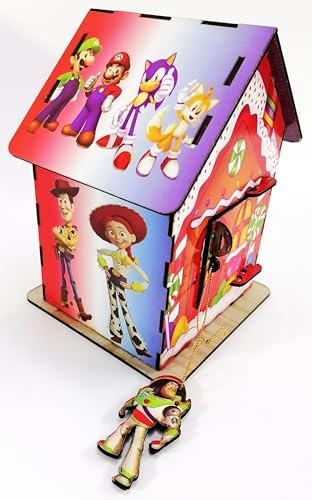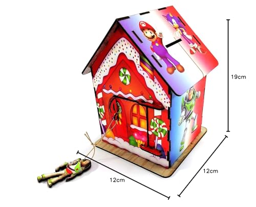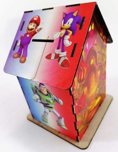 Generic - حصالة نقود اطفال من الخشب علي شكل منزل بقفل لون احمر و ابيض عليها رسومات كرتونية ماريو