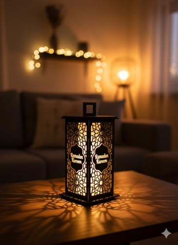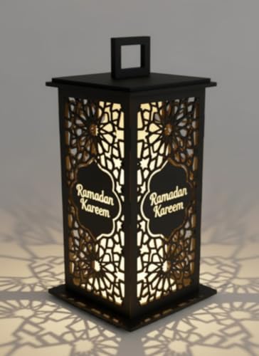 Generic - فانوس رمضان كريم خشبي، نمط هندسي اسلامي، صندوق اضاءة LED مع عرض الظل، ارتفاع 30 سم، عرض 10 سم (اسود)