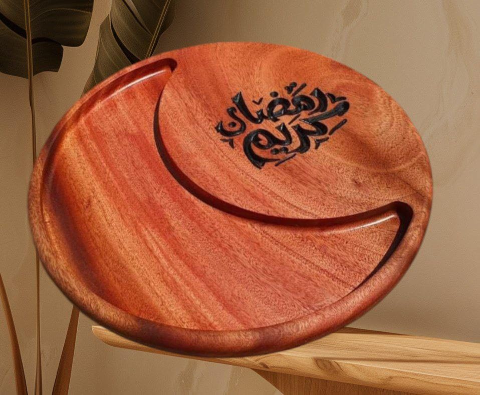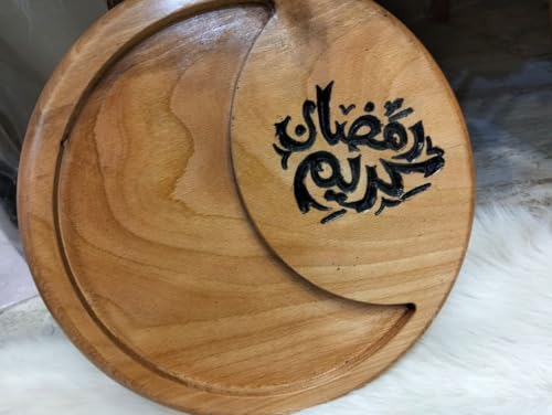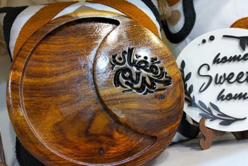 Generic - طبق تقديم خشب لرمضان بتصميم مزين بفن خط العربي، صينية دائرية من خشب طبيعي بنمط رمضان