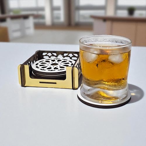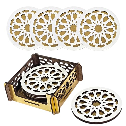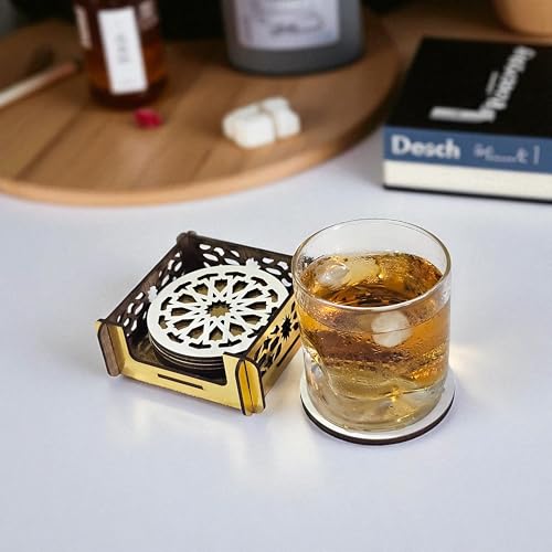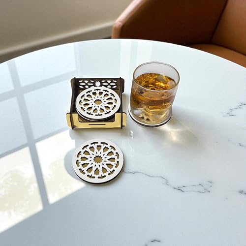 Woodiano - مجموعة قواعد أكواب خشب دائرية مكونة من 4 قطع مع حامل، قواعد أكواب فاخرة للمشروبات الساخنة والباردة، مناسبة لطاولة القهوة أو المكتب أو المنزل، تصميم خشبي للمشروبات الساخنة والباردة (دائرية)