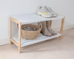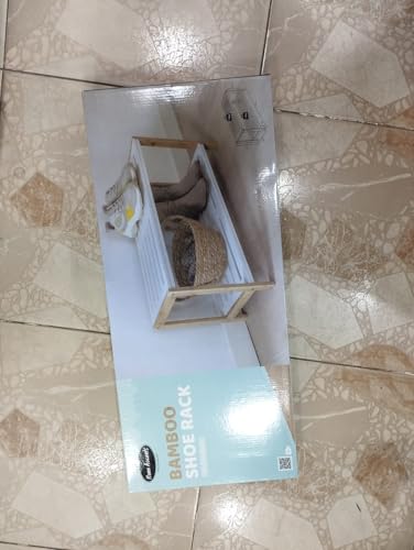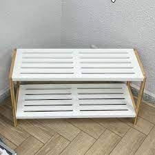 - ١) التصميم: رف أحذية خشبي بطابقين بتصميم بسيط وأنيق، مثالي للمداخل والممرات