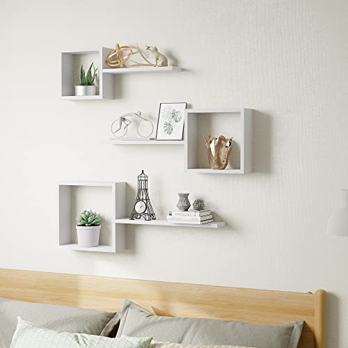 LUDORU - مجموعة أرفف خشبية مربعة عائمة تثبت على الحائط مكعبة مكونة من 6 قطع حائط هندسية لتزيين صندوق لغرفة النوم وغرفة المعيشة والحمام والمطبخ والمكتب أبيض صنوبر