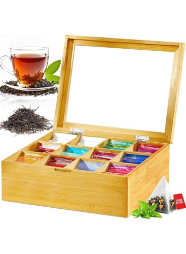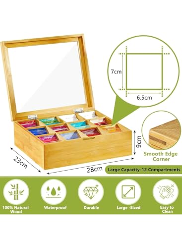 generic - منظم صندوق شاي خشبي لاكياس الشاي - علبة شاي من 12 قسم مع غطاء شفاف - صندوق تخزين اكياس الشاي وحامل للمجموعة