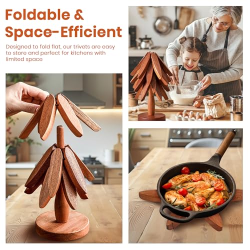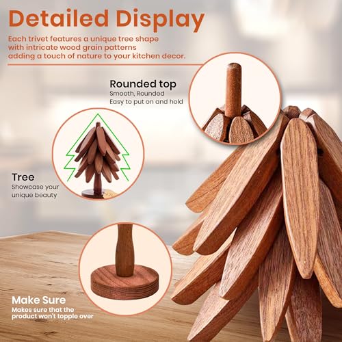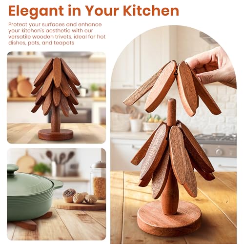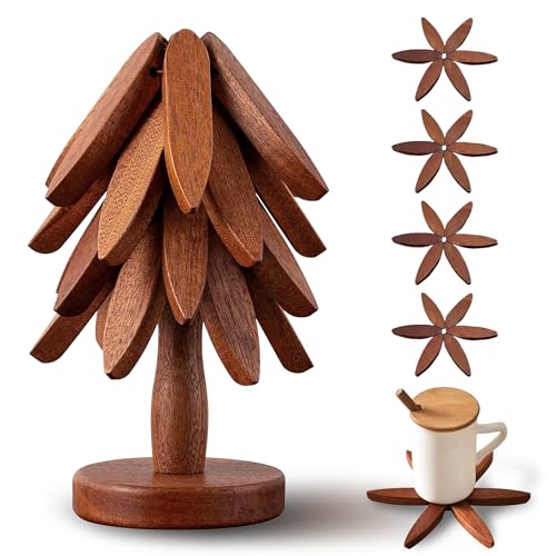 PICCIES - مجموعة قواعد اكواب خشبية للاطباق الساخنة، مجموعة من 4 قطع مع حامل، شجرة خشبية موفرة للمساحة للمطبخ، مجموعة حوامل شجرة خشبية فاخرة للاواني الساخنة والمقالي وحماية الطاولة