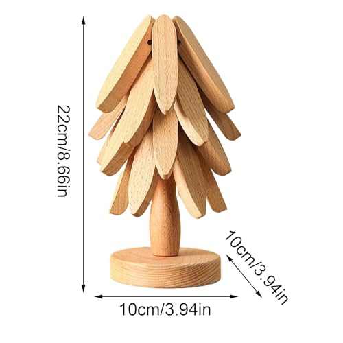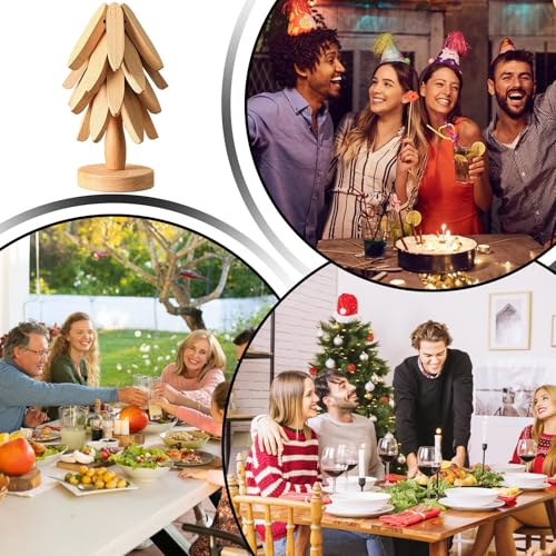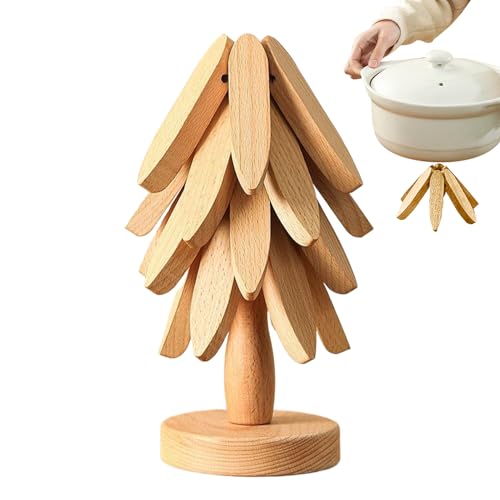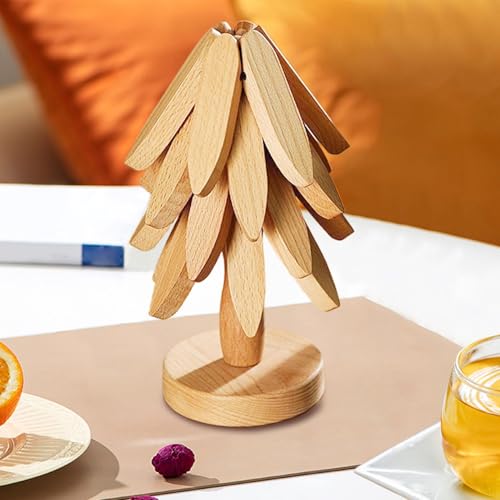 Lanmijia - حامل خشبي للاطباق الساخنة، 4 قواعد اكواب خشبية على شكل شجرة + 1 حامل شجرة الكريسماس، قواعد اكواب قابلة للطي، وسادات مقاومة للحرارة للاواني الساخنة والمقالي والاوعية
