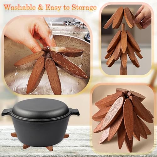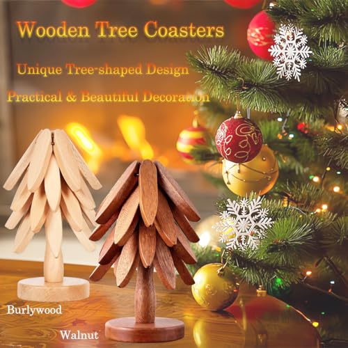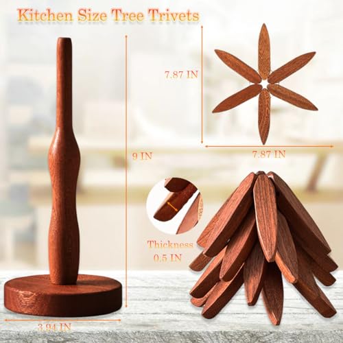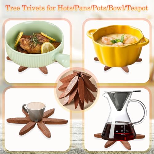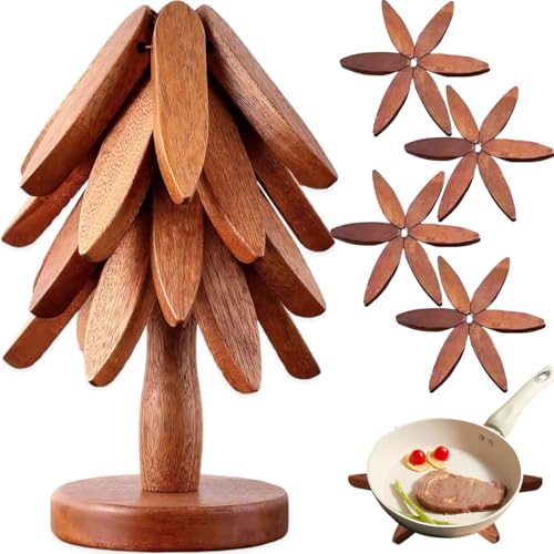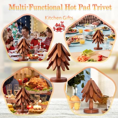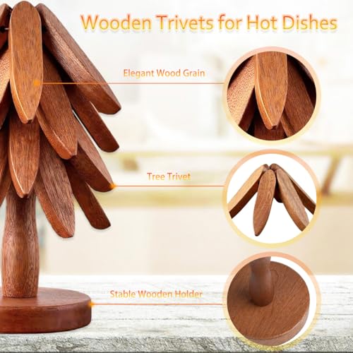 DOLRRCM - حوامل خشبية للاطباق الساخنة، مجموعة من 4 قطع على شكل شجرة مع حامل مخزن، حوامل قابلة للطي للاواني الساخنة والمقالي، وسادات ساخنة لديكور المطبخ، قواعد اكواب شجرة الكريسماس للاطباق الساخنة/الاواني/الوعاء