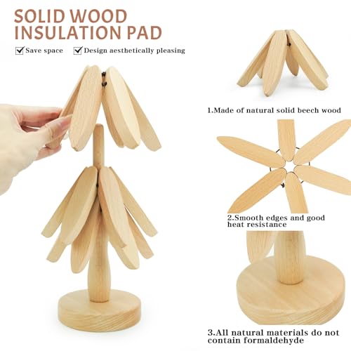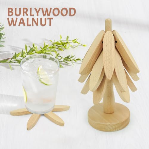 Bonhomstyle - حامل خشبي للأطباق الساخنة، قاعدة أكواب على شكل شجرة كريسماس طبيعية وقابلة للطي للمطبخ، وسادات ساخنة للأواني والطاسات، 3 حوامل خشبية وحامل وملعقة عسل