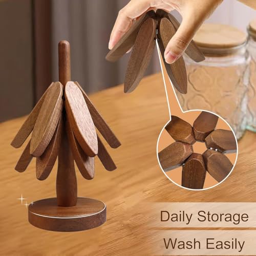 - تصميم ذكي: تحتوي كل دعامة خشبية للأطباق الساخنة على ست قطع خشبية صغيرة يمكن أخذها من الدعامة ووضعها على الطاولة. يمكن وضع الأطباق الساخنة أو الأكواب ببطء من الأعلى، وبسبب الجاذبية، ستفتح تلقائيًا وتلعب دورها المناسب. يمكن طيها وتخزينها لتوفير المساحة
