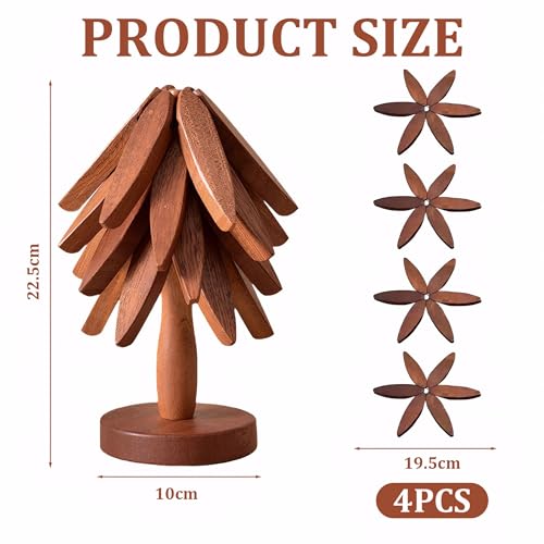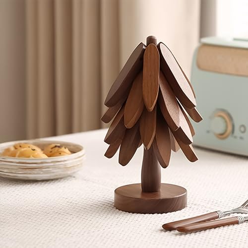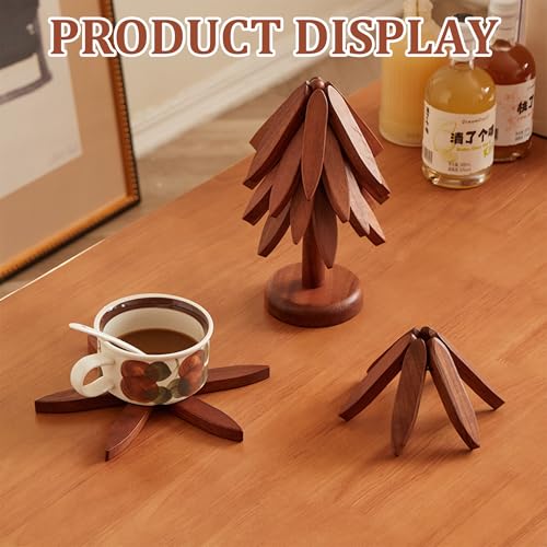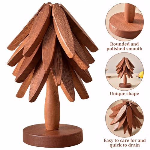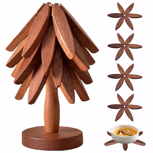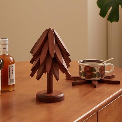 Laueob - حوامل خشبية للاطباق الساخنة، مجموعة مفارش عازلة للطاولة على شكل شجرة الجوز للاواني الساخنة والمقالي، قواعد اكواب قابلة للطي لشجرة الكريسماس مكونة من 4 طبقات + حامل واحد
