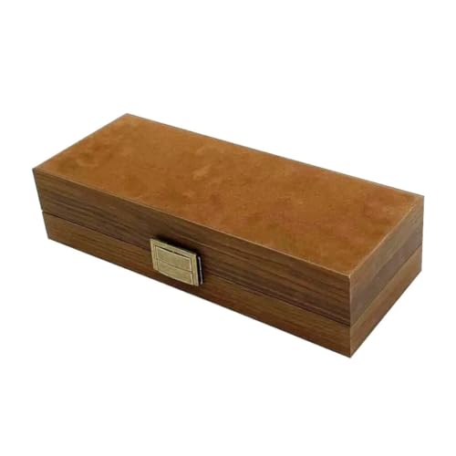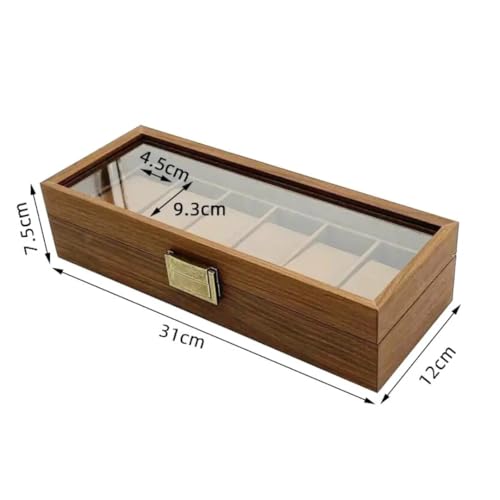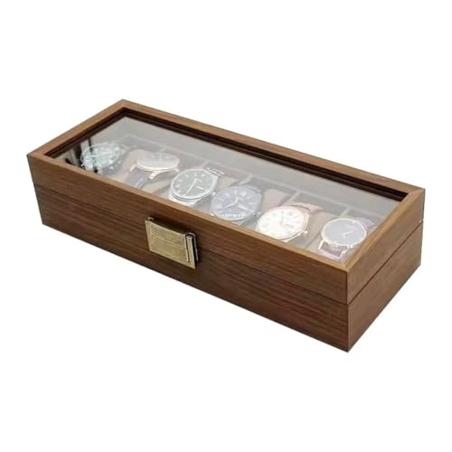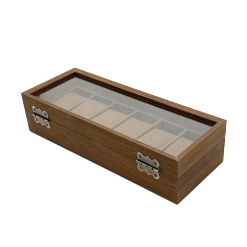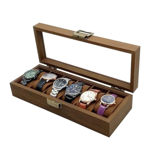 Generic - صندوق خشبي مستطيل أنيق لتنظيم الساعات يتسع لـ 6 ساعات مع غطاء زجاجي وبطانة داخلية من القطيفة باللون البني