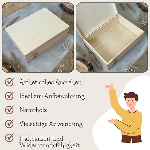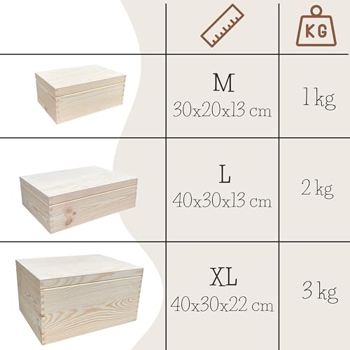 - صندوق خشبي كبير مع غطاء، صندوق خشبي مصنوع من خشب الصنوبر عالي الجودة. يبلغ حجم الصندوق 40 × 30 × 13 سم. القاعدة والغطاء مصنوعان من الخشب الرقائقي 3 ملم. الأبعاد الداخلية 38 × 28 × 11 سم..