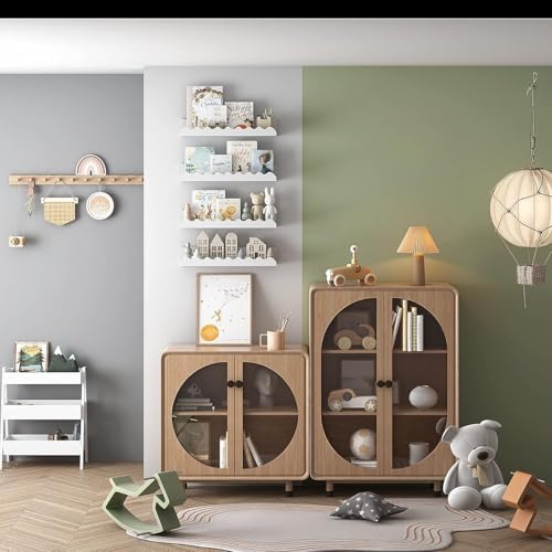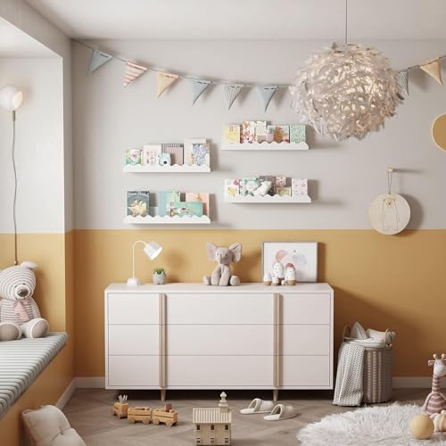 WooDinto - مجموعة ارفف كتب عائمة من وودنتو مكونة 4 - 18 انش رف حافة للصور لتزيين الحائط والتخزين - مثالي للكتب والالعاب واطارات الصور وديكور الحضانة ابيض خشب مُصنع