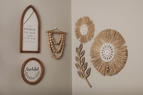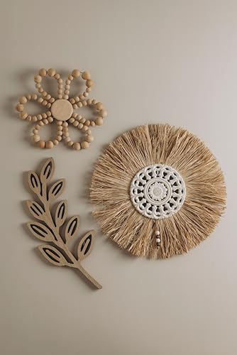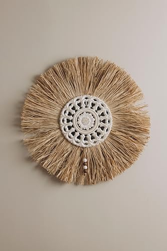 Generic - ووردز كو - وردة دائرية من القش بنمط بوهو تعلق على الحائط وكبيرة 50 سم منسوجة من الرافيا مع ديكور من الخشب مستوحى من الطبيعة