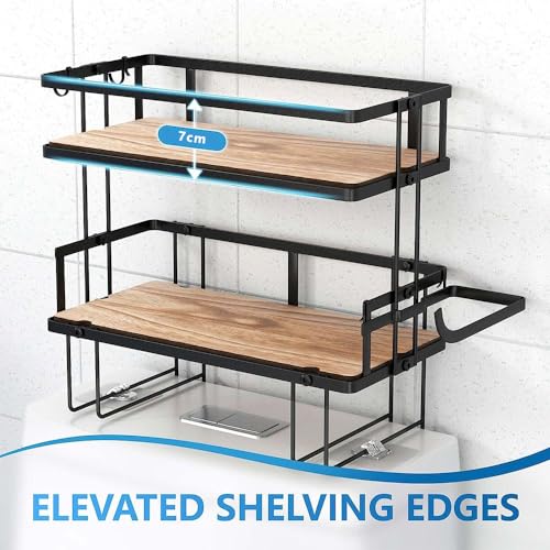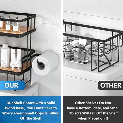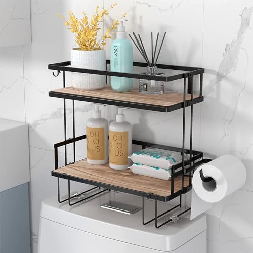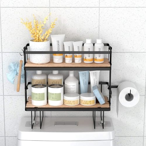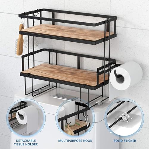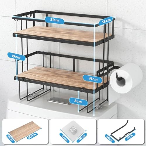 Wotendy - رف تخزين للحمام من وتيندي مكون طبقتين فوق التواليت مع لوحة قاعدة خشبية وقاعدة لاصقة منظم حمام مزود بخطافات تعليق ورقية ملفوفة مطلى