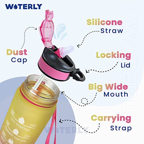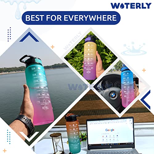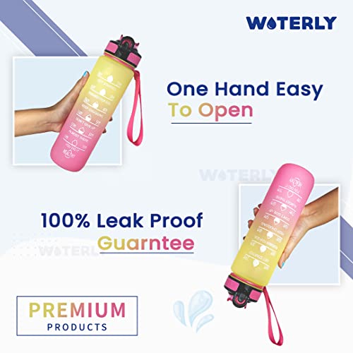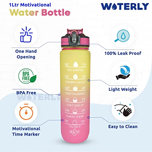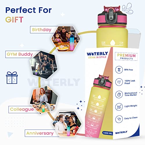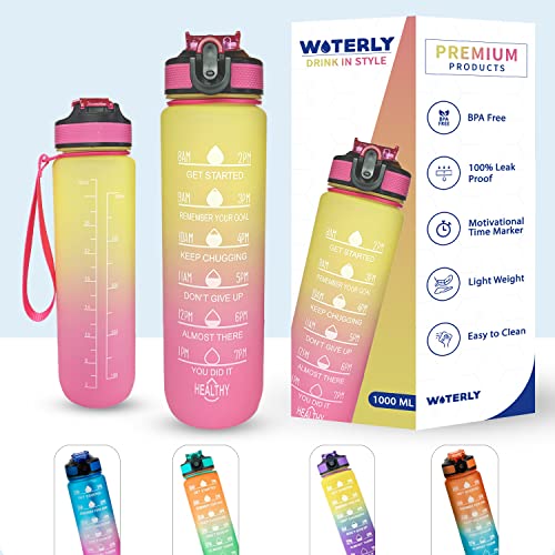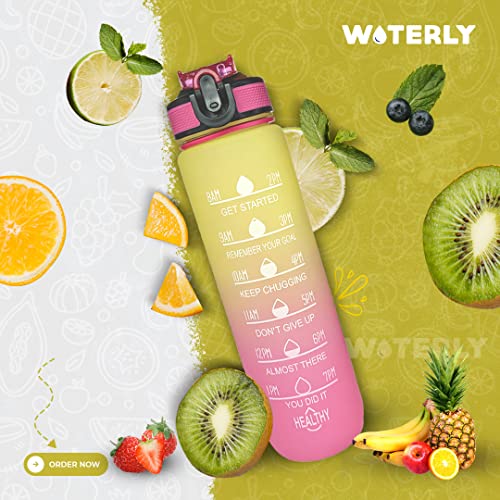 WOTERLY - زجاجة مياه تحفيزية رياضية بعلامات زمنية لتتبع شرب الماء والتذكير بالشرب غير قابلة للكسر ومانعة للتسرب وخالية من مادة بيسفينول أ للجيم والمكتب والسفر من ووترلي (لون أصفر وأرجواني، سعة 1 لتر)