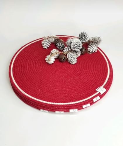 - قطعة مركزية احتفالية: هذا المفرش المستدير المصنوع من نسيج محبوك باللون الأحمر الزاهي مع حواف بيضاء يُعتبر قطعة مركزية لافتة للأنظار لتهيئة طاولات العطلات.