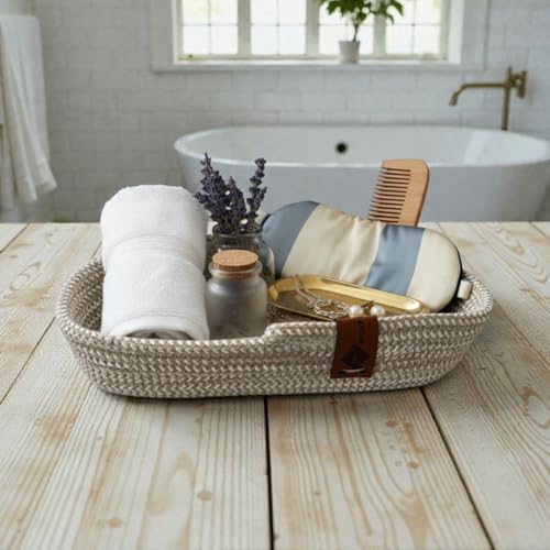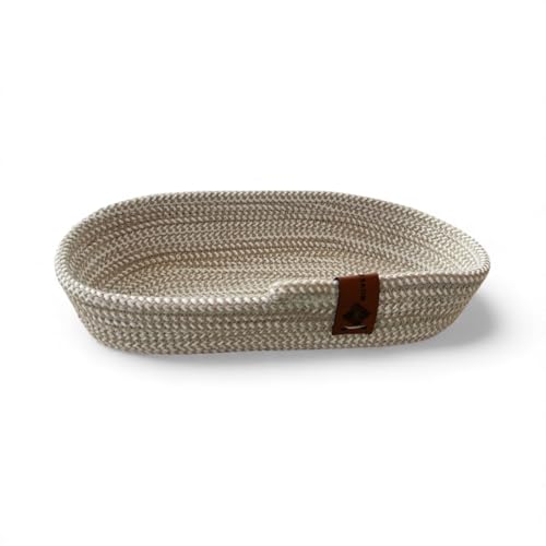 Woven it - سلة قطنية بيضاوية من ووفن ات، لون بيج واوف وايت، 26 سم × 14 سم × 4 سم، سلة تخزين ومنظم. يمكن استخدامها في المطبخ وغرفة الطعام وغرفة المعيشة وغرفة النوم وغرفة الاطفال والحمام والاماكن الداخلية