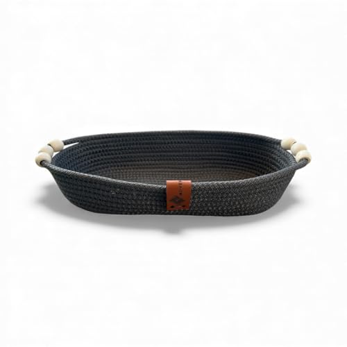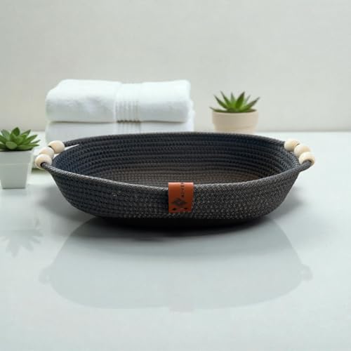 Woven it - طبق قطن بيضاوي رمادي مع ملحقات خشبية 27 سم × 15 سم × 6 سم، سلة تخزين ومنظم. يمكن استخدامه في المطبخ وغرفة الطعام وغرفة المعيشة وغرفة النوم وغرفة الاطفال والحمام والاماكن الداخلية والخارجية.
