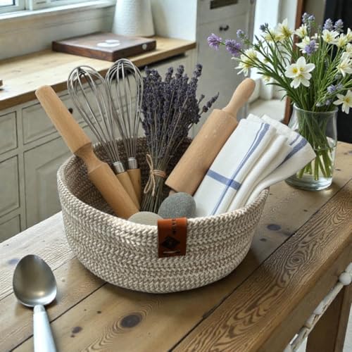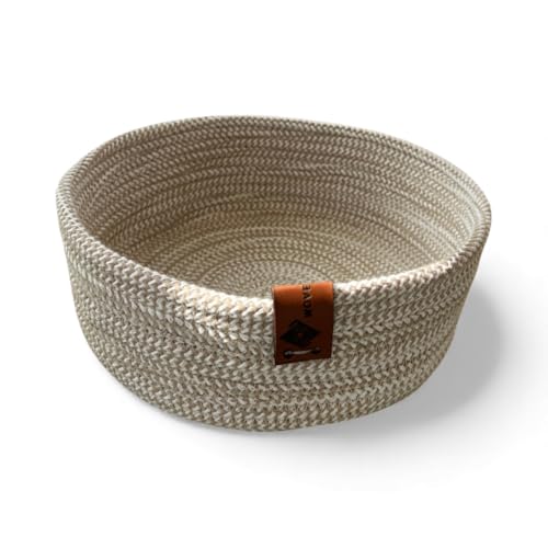 Woven it - سلة تخزين ومنظم من القطن بتصميم دائري مختلط بلون بيج واوف وايت، مقاس 22 سم × 8 سم، يمكن استخدامها في المطبخ وغرفة الطعام وغرفة المعيشة وغرفة النوم وغرفة الاطفال والحمام والاماكن الداخلية والخارجية.