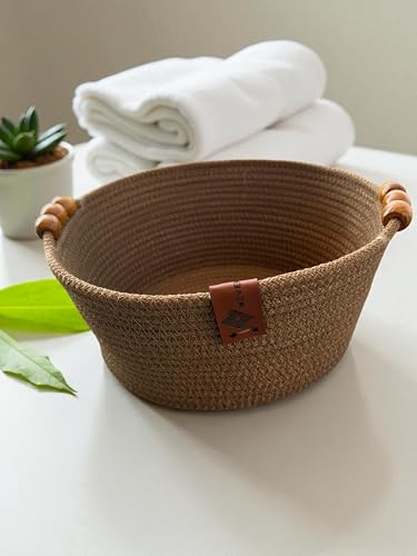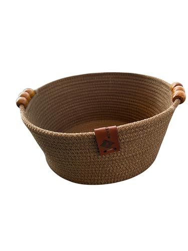 Woven it - طبق دائري من القطن بلون بني فاتح مع ملحقات خشبية مقاس 20 سم × 10 سم، سلة تخزين ومنظم. يمكن استخدامه في المطبخ وغرفة الطعام وغرفة المعيشة وغرفة النوم وغرفة الاطفال والحمام والاماكن الداخلية والخارجية.