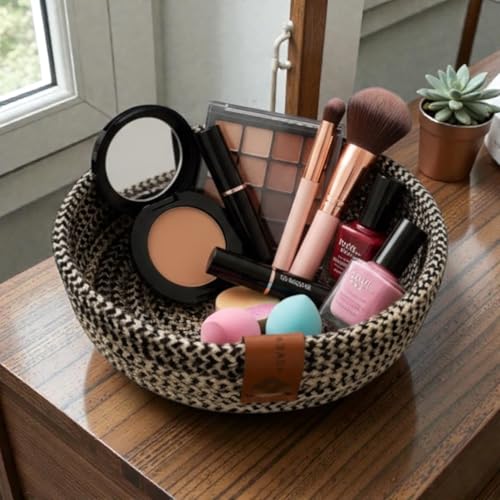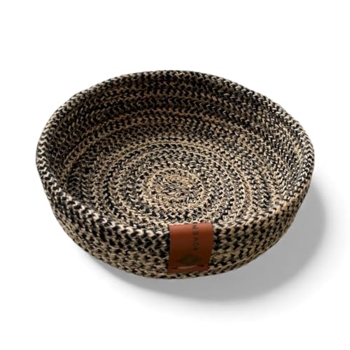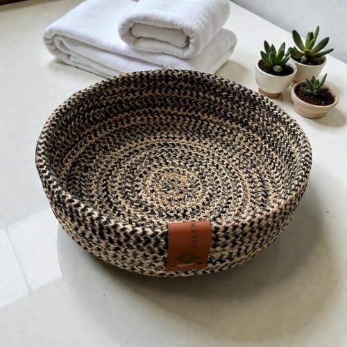 Woven it - سلة صغيرة دائرية من القطن بلون اسود وبيج مقاس 17 سم × 4 سم، سلة تخزين ومنظم. يمكن استخدامها في المطبخ وغرفة الطعام وغرفة المعيشة وغرفة النوم وغرفة الاطفال والحمام والاماكن الداخلية والخارجية.