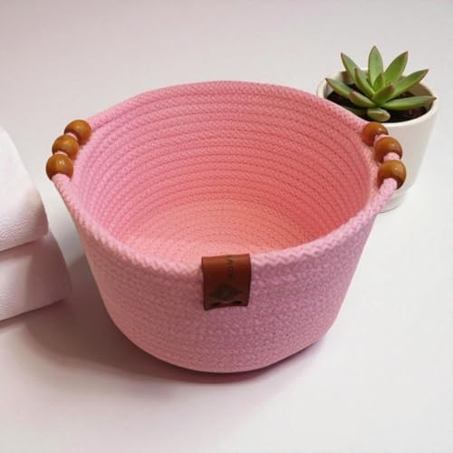 Woven it - طبق منظم مصنوع يدويا من القطن بلون بينك مع ملحقات خشبية 20 سم × 10 سم، يمكن استخدامه في المطبخ والمرحاض وغرفة النوم وغرفة الاطفال وغرفة الطعام من الداخل والخارج.