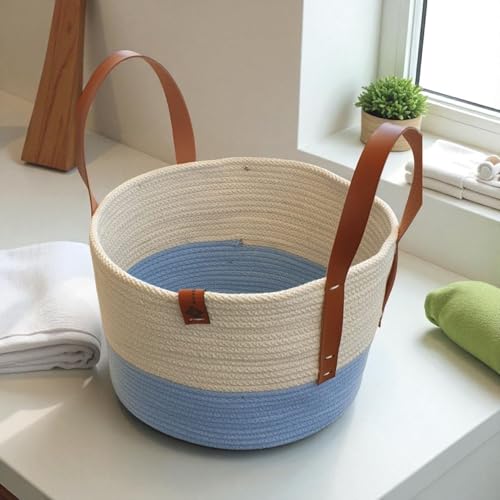 Woven it - سلة تخزين دائرية مصنوعة يدويا من القطن بلون ازرق فاتح وابيض مقاس 30 سم × 20 سم، يمكن استخدامها في المطبخ والمرحاض وغرفة النوم وغرفة الاطفال وغرفة المعيشة وغرفة الطعام من الداخل والخارج.