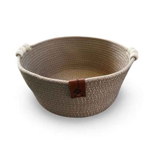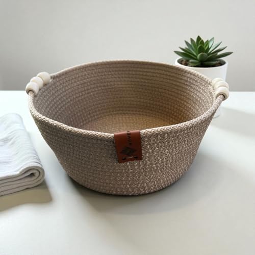 Woven it - طبق ذهبي دائري مصنوع يدويا من القطن مع ملحقات خشبية 20 سم × 10 سم، سلة تخزين ومنظم، يمكن استخدامه في المطبخ وغرفة الطعام وغرفة المعيشة وغرفة النوم وغرفة الاطفال والحمام والاماكن الداخلية والخارجية.