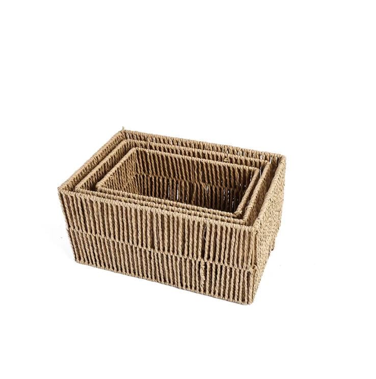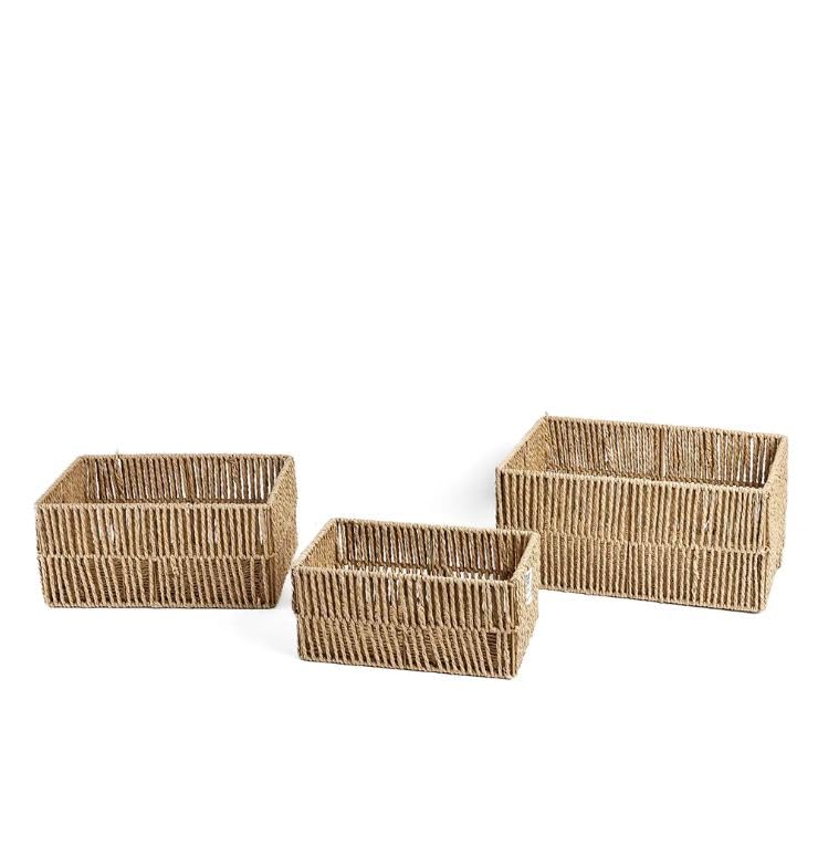 - مجموعة تخزين متداخلة: مجموعة من 3 سلال مستطيلة منسوجة من الأعشاب البحرية باللون البني الطبيعي تتداخل داخل بعضها البعض للتخزين المريح عند عدم الاستخدام