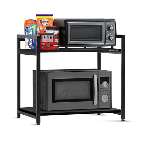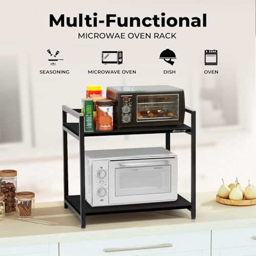 - هيكل قوي وتصميم متين: يوفر الإطار المعدني المصمم جيدًا لحامل الميكروويف هذا الثبات والقدرة على التحمل. يمكن للطبقة العلوية حمل الطعام والأواني والمقالي والأطباق والأكواب وغيرها من ملحقات المطبخ.