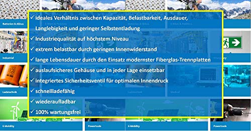- المزايا: تقنية حصيرة زجاجية ماصة (ايه جي ام)، لا تحتاج إلى صيانة (لا حاجة لإعادة ملء الماء)، محكمة الغلق، منظم بالصمام (VRLA), تفريغ ذاتي منخفض جدًا، < 3% شهريًا، عمر خدمة طويل جدًا