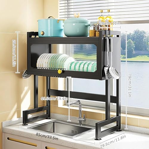 WUDLEP - رف أطباق من ودليب مصنوع من الفولاذ الكربوني، لون أسود، للأواني وأدوات المائدة والمطبخ، مع باب مضاد للغبار وتصريف مهوى وقاعدة مضادة للانزلاق، 3 طبقات