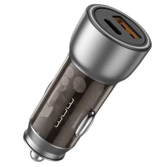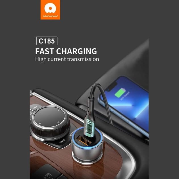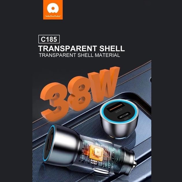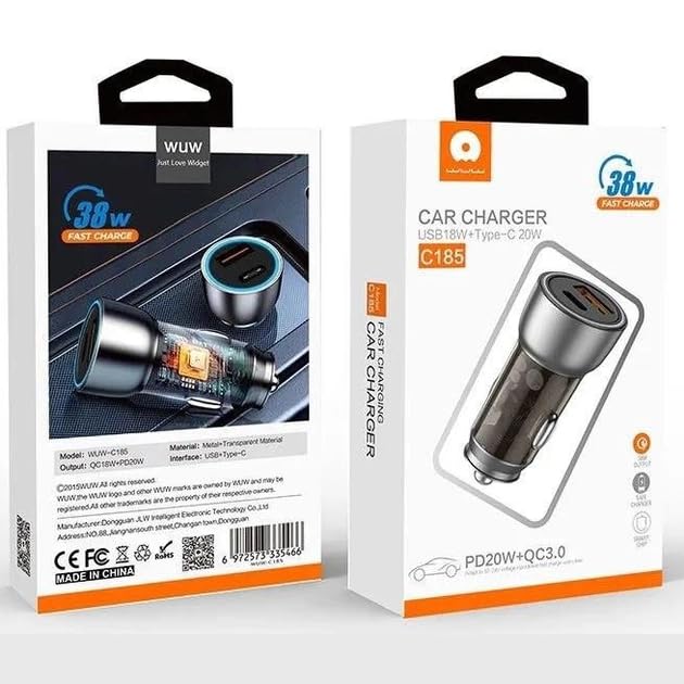 WUW - WUW شاحن سيارة C185، 38 واط شحن سريع، منفذ مزدوج Type-C + USB، PD20W + QC3.0، هيكل شفاف