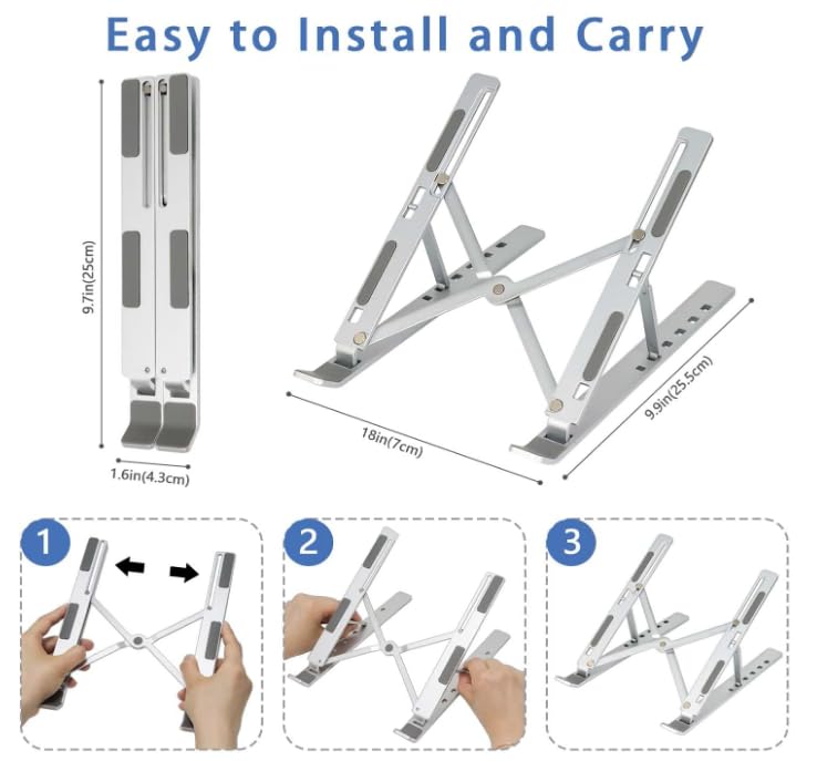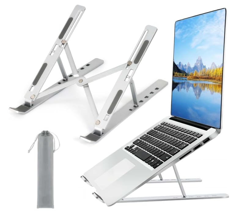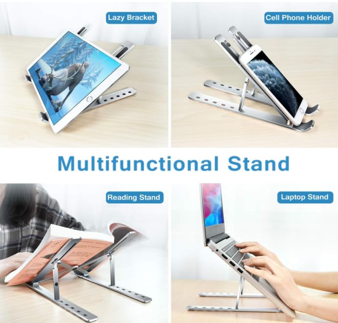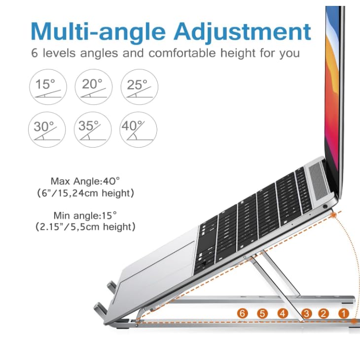 XaVi - حامل لاب توب من الألومنيوم قابل للتعديل بست زوايا مع وسادات مانعة للانزلاق للمساعدة على منع السخونة الزائدة بتصميم محمول وقابل للطي متوافق مع ماك بوك واتش بي وديل ولينوفو وغيرها، لون فضي