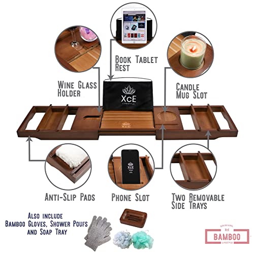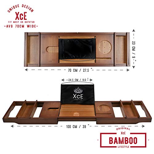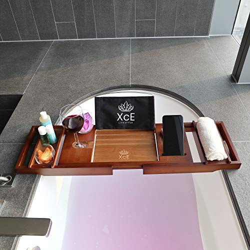 XcE - اكس سي اي صينية حمام قابلة للتوسيع من 70 سم الى 102 سم مع حامل كتب قماشي قابل للازالة، بني داكن