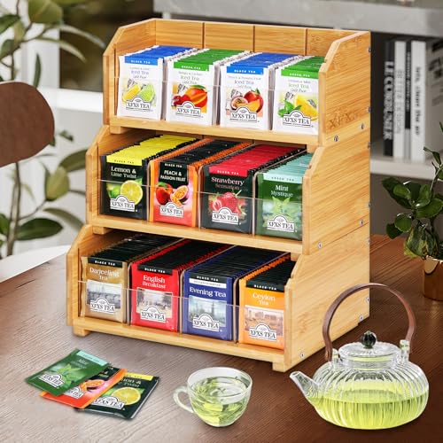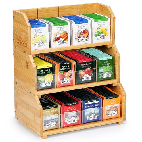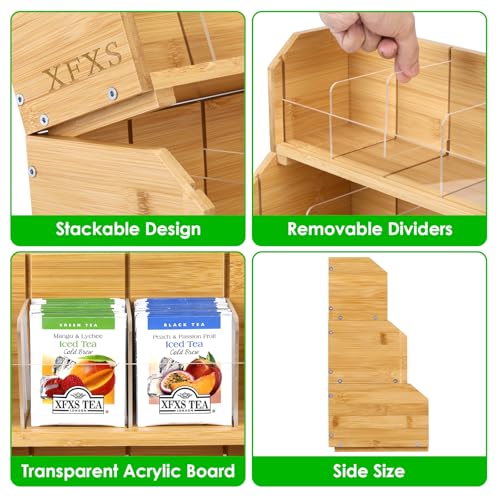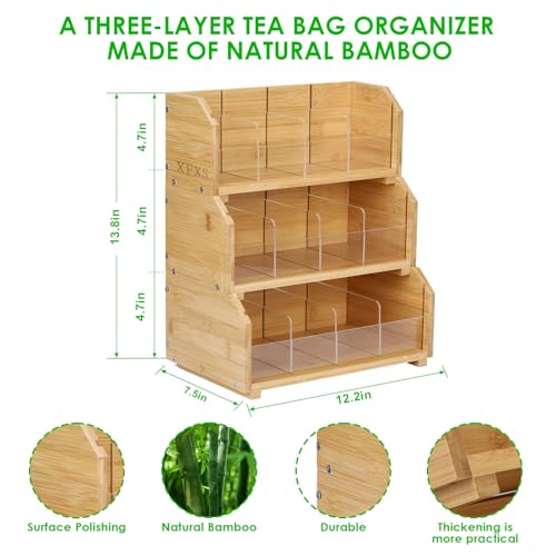 XFXS - منظم أكياس الشاي، صندوق تخزين خشب قابل للرص بثلاث طبقات من 12 قسم مصنوع من الخشب الطبيعي والاكريليك، مناسب لسطح الطاولة ودولاب المطبخ من اكس اف اكس اف (3 طبقات)