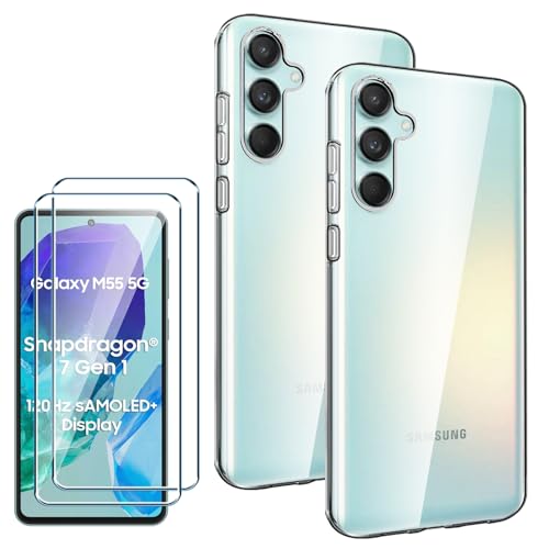 Xiangyun - جراب موبايل لهاتف سامسونج جالاكسي M55 شبكة الجيل الخامس 5G من شيانغيون، 2 جراب شفاف + 2 غشاء حماية من الزجاج المقوى - جراب سيليكون حماية ناعم خفيف من البولي يوريثين المقاوم للحرارة (6.7 بوصة)