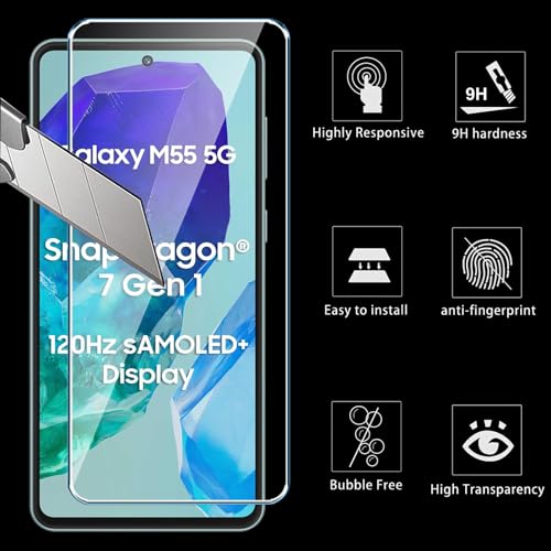 - شاشة حماية من الزجاج المقوى لهاتف سامسونج جالاكسي M55 5G بدرجة صلابة 9H (أقوى من السكاكين ومفاتيح العد). يحمي شاشة هاتفك من السقوط والخدوش والصدمات والكشط.