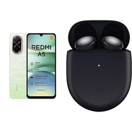 XIAOMI - موبايل شاومي ريدمي A5 (4 جيجابايت/128 جيجابايت) + سماعات تي دبليو اس | 5200 مللي امبير في الساعة، كاميرا 32 ميجابكسل | سماعات: بخاصية إلغاء الضوضاء النشطة ANC، تشغيل 30 ساعة، IP54، لمس ذكي، صوت هاي