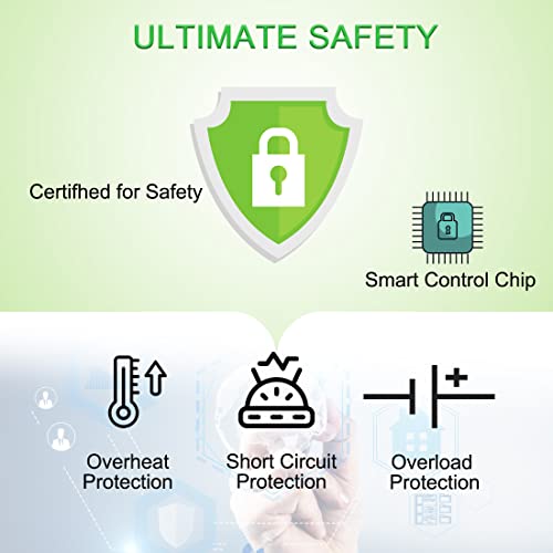 - آمنة ومستقرة: نظام حماية من الحمل الزائد، ومن التيار الكهربائي الزائد، حماية من الدوائر الكهربائية القصيرة، ومن درجة الحرارة المرتفعة لضمان الاستخدام الآمن. خلايا من الفئة ايه: لا يوجد تأثير على الذاكرة، توفر شحنًا سريعًا واستهلاكًا منخفضًا للطاقة. إرشادات صارمة للتوافق والامتثال لمعايير السلامة البيئية. مطورة 100% من قبل الشركة المصنعة.