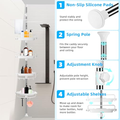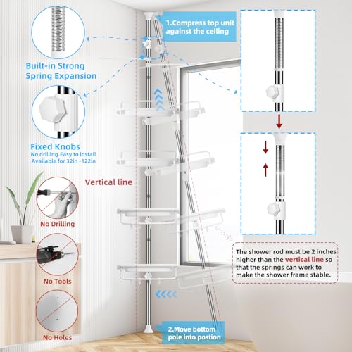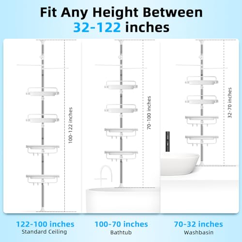 XLHOMO - منظم دش بتصميم بعمود بارتفاع قابل للتعديل من 81 سم إلى 3 م و4 رفوف تنظيم مقاومة للصدأ للتثبيت بدون ثقب لحوض الاستحمام من اكسلهومو