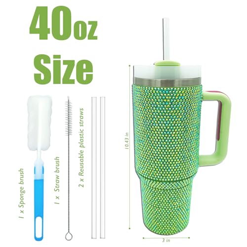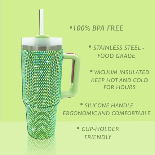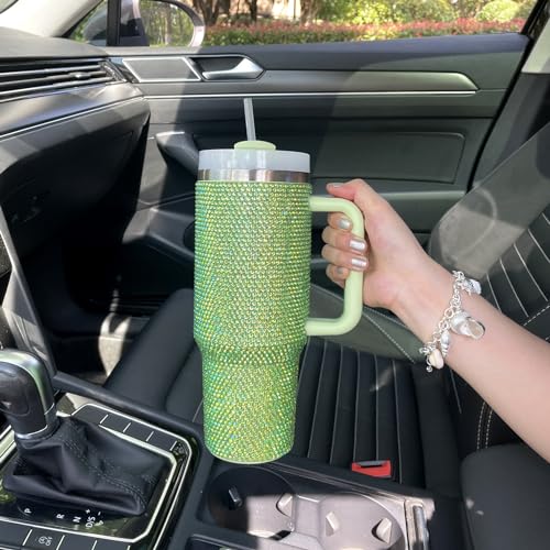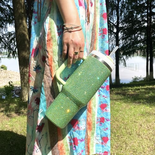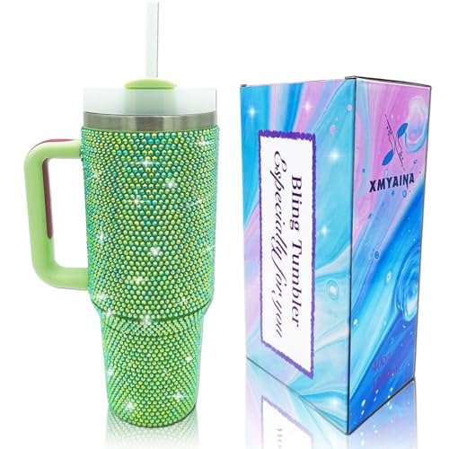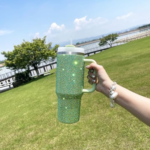 XMYAINA - كوب بلينج سعة 1.120 لتر مع مقبض وغطاء ماصة مرصع بأحجار الراين، كوب معزول بتفريغ الهواء من الفولاذ المقاوم للصدأ بجدار مزدوج من اكس ام واي اينا، مناسب كهدية للنساء (أخضر)